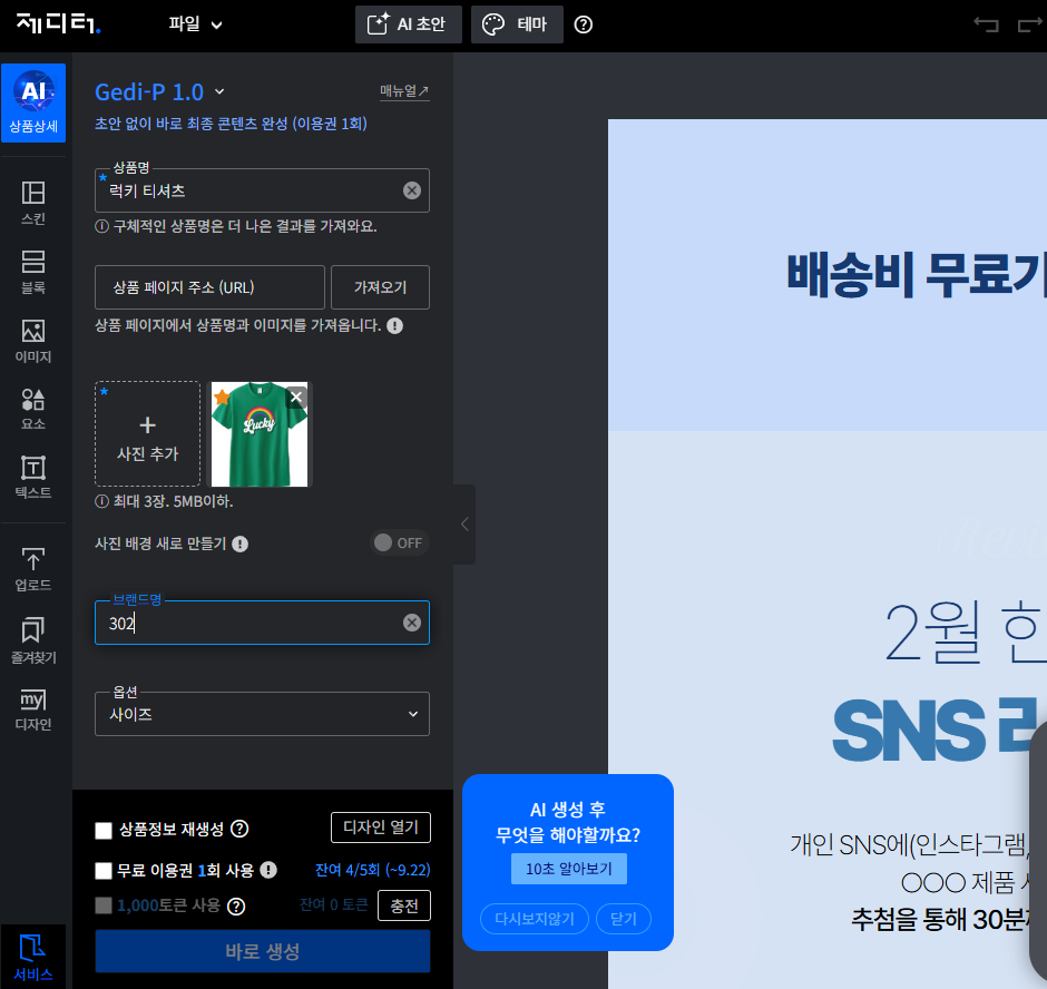 제디터의 가장 큰 장점은 AI로 상세페이지를 제작할 수 있다는 것인데요. AI 로 제작하는 과정을 살펴보겠습니다.